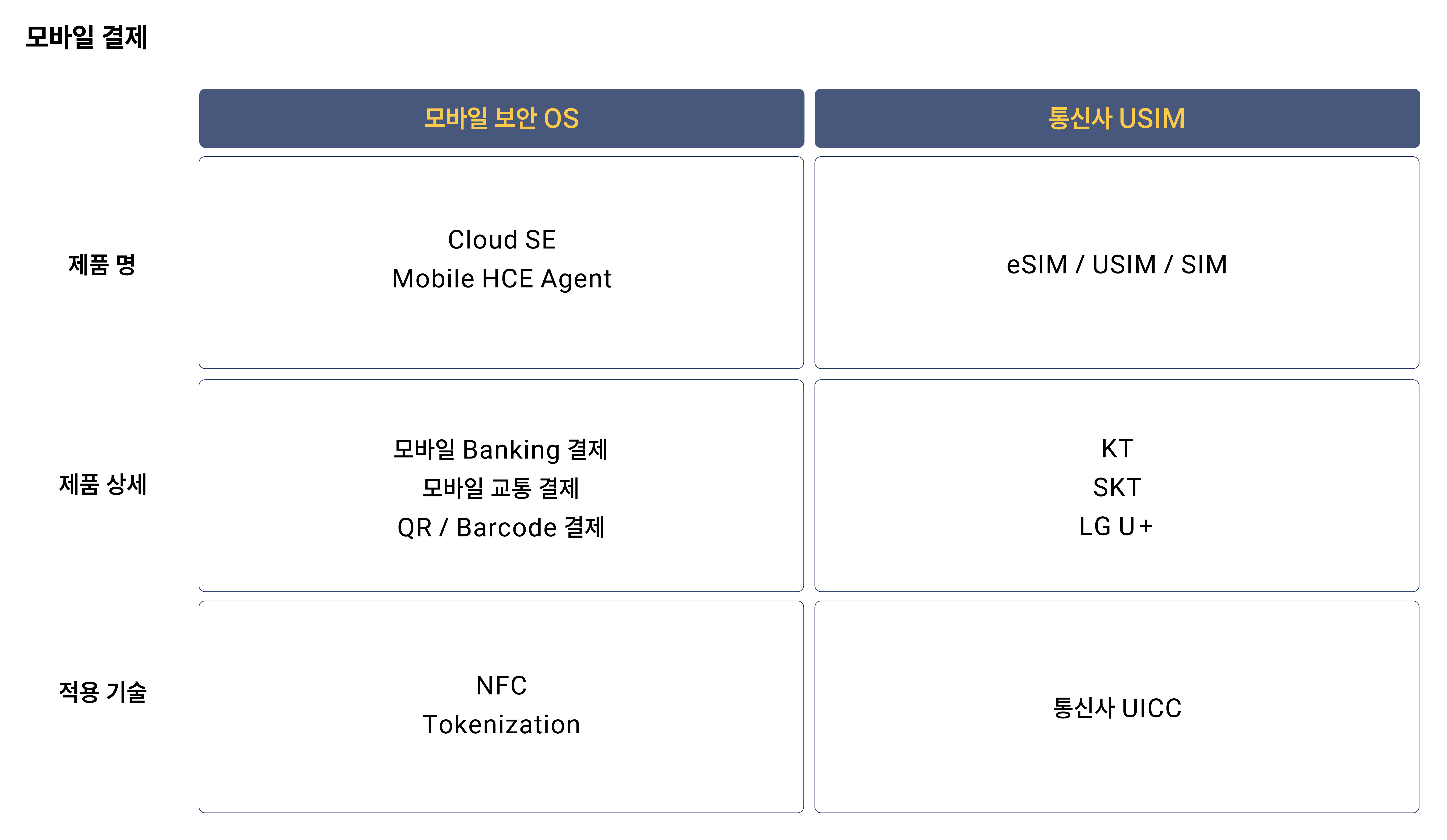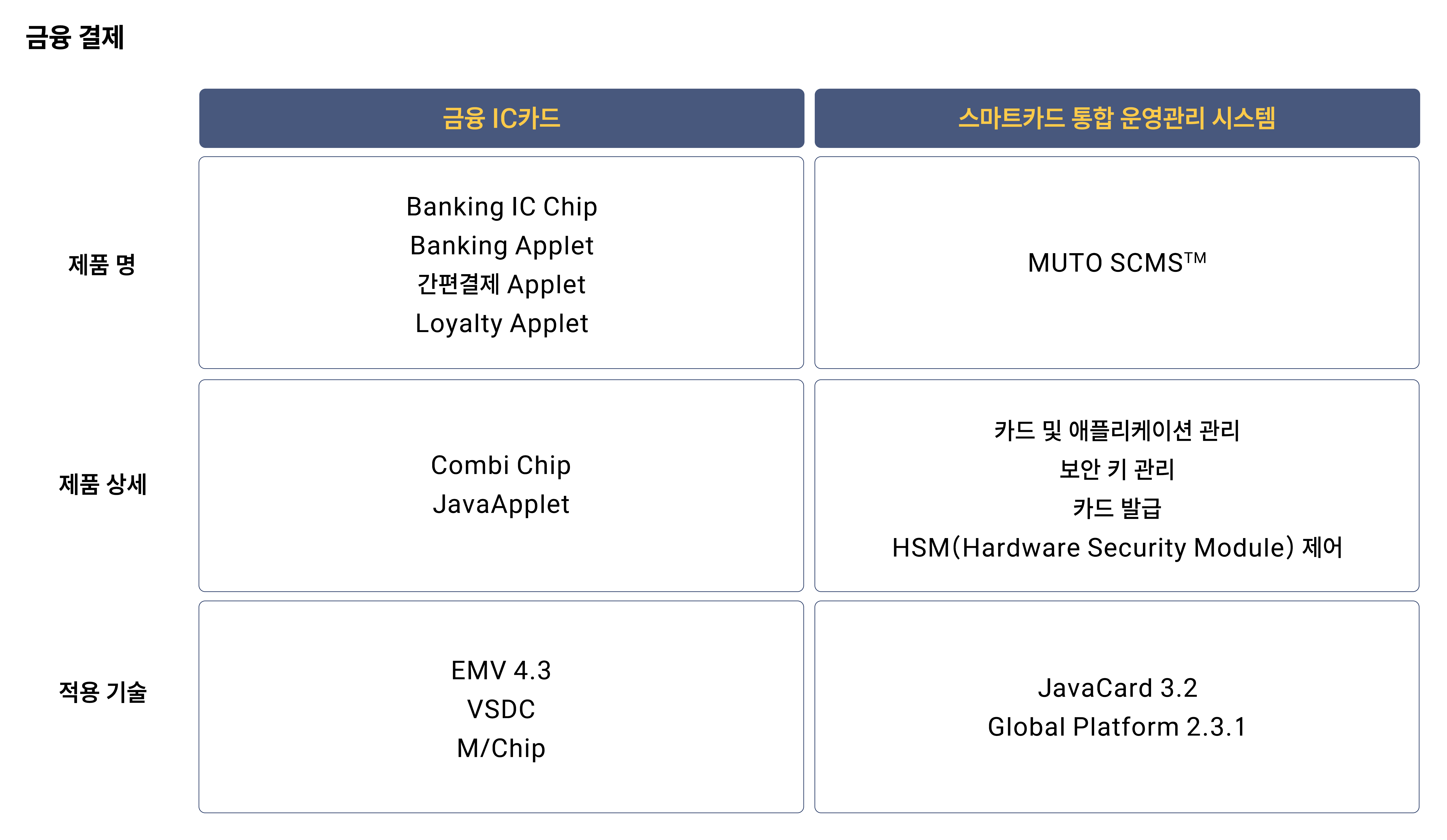 핀테크(FinTech)분야에 있어 온라인과 오프라인을 넘나드는 결제서비스는 그 핵심 요소로 자리하고 있습니다. 우리는 모바일결제를 위한 결제Application과 결제보안기술을 보유하고 있으며, 오프라인결제의 핵심인 사용자카드와 결제단말SAM 보안OS 구현기술을 보유하고 있습니다. 또한, 사용자 및 기기 인증을 위한 PUF솔루션을 통해 강력한 보안인증수단을 제공합니다.